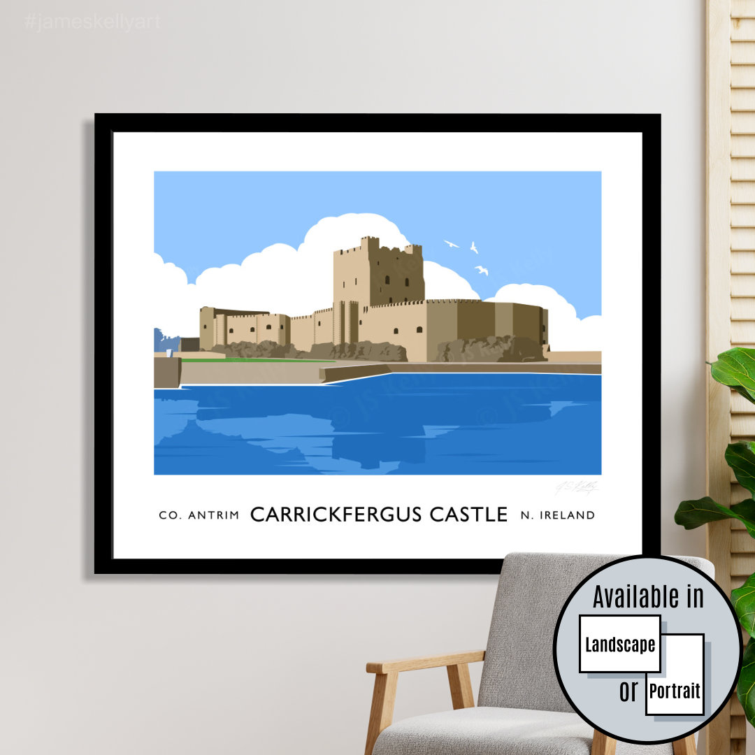Vintage style travel poster art print of Carrickfergus Castle in County Antrim.