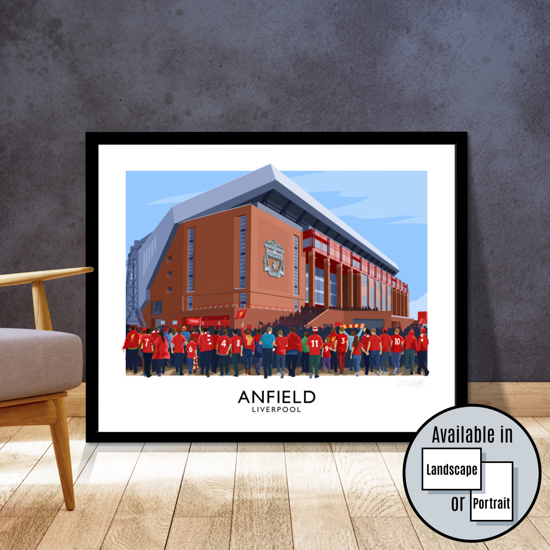 Vintage style poster art picture of Liverpool FC supporters arriving at Anfield stadium. #YNWA