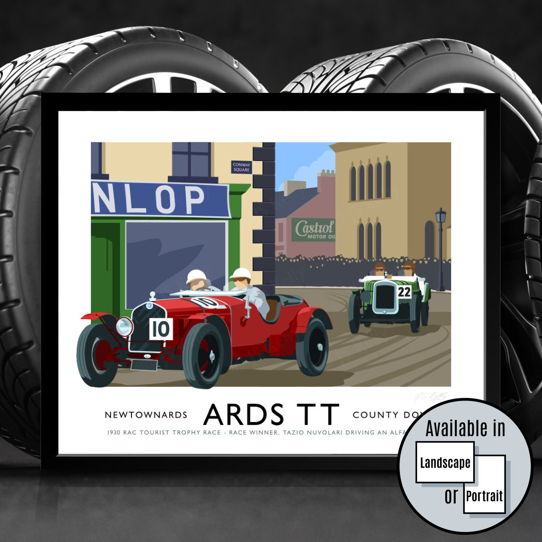 Art Deco print of the 1930 Ards TT race featuring the winner Tazio Nuvolari in an Alfa Romeo. Inspired by the vintage railway posters of the 1920s and 1930s
