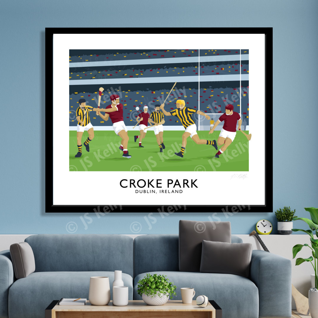A vintage style picture of a GAA hurling match between Galway and Kilkenny at Croke Park, Dublin.