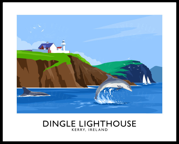 Vintage style art print of dolphins near Dingle Lighthouse, County Kerry.