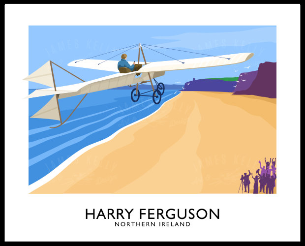 Stylish Art Deco print of Harry Ferguson flying his monoplane in Northern Ireland. Inspired by the old vintage railway posters of the 1920s and 1930s.