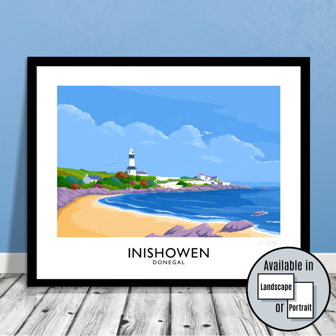 Vintage style travel poster art print of Stroove Lighthouse at Inishowen Head in County Donegal.