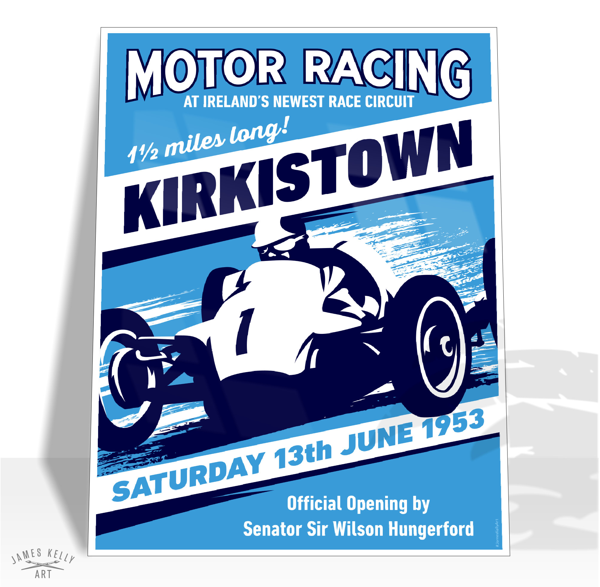 Retro poster for the first race car meeting at the Kirkistown racing circuit in County Down, featuring a classic Cooper 500.