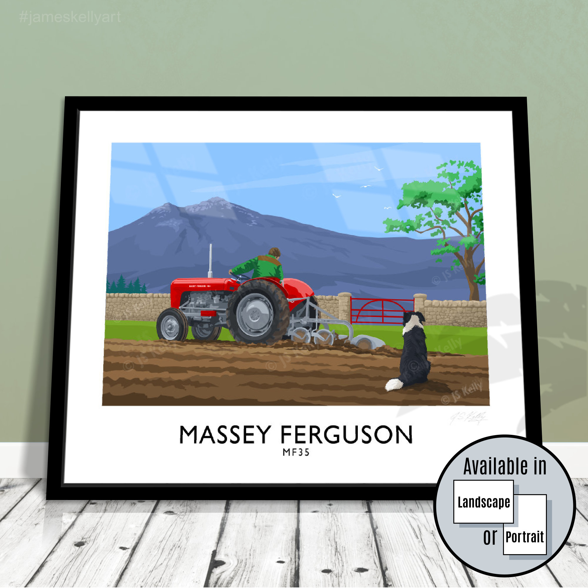 Vintage style travel poster art print of an old Massey Ferguson MF35 tractor ploughing a field