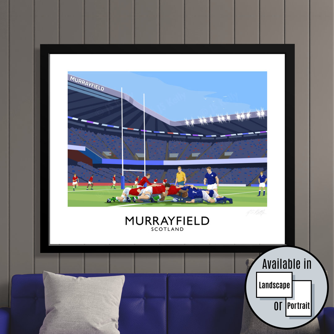 A hand-signed, Art Deco style original art print of an International rugby match between Scotland and Wales at Murrayfield Stadium in Edinburgh, Scotland.