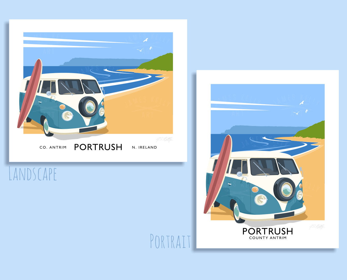 Stylish Art Deco print of a VW camper van on the beach at Portrush, County Antrim, Northern Ireland. Inspired by vintage railway posters of 1920s and 1930s.