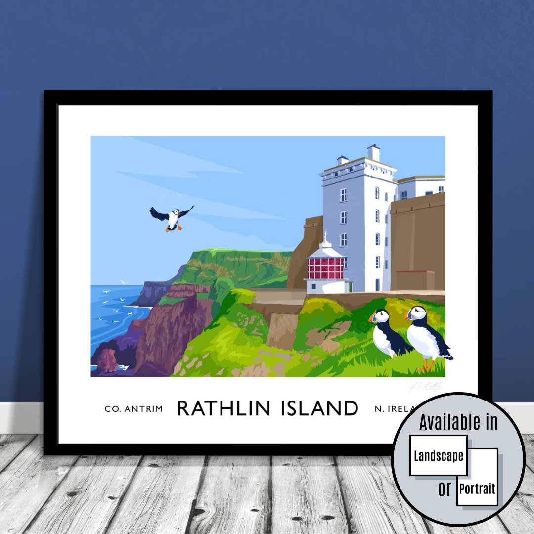 Vintage style travel poster art print of the West Lighthouse and Puffins on Rathlin Island, County Antrim.