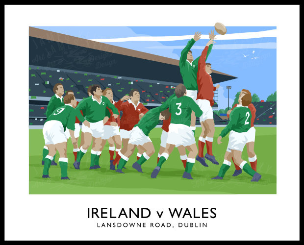 Stylish vintage style art print of Ireland v Wales in a Home Nations rugby match at Lansdowne Road, Dublin.