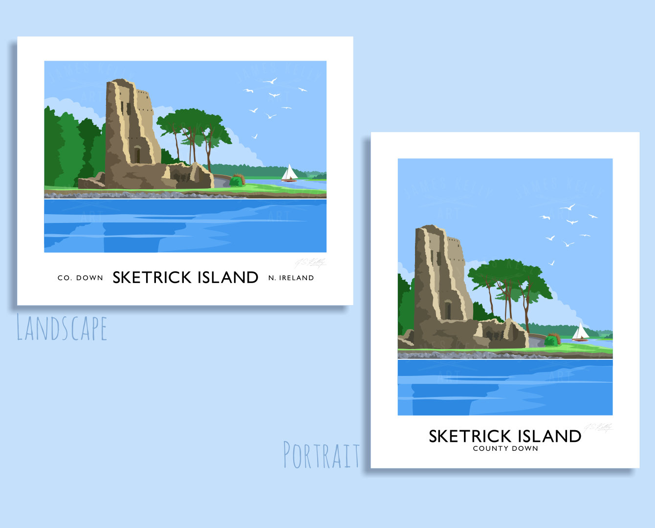 Vintage style art print of Sketrick Castle on Sketrick Island on the coast of Strangford Lough near Whiterock, County Down.