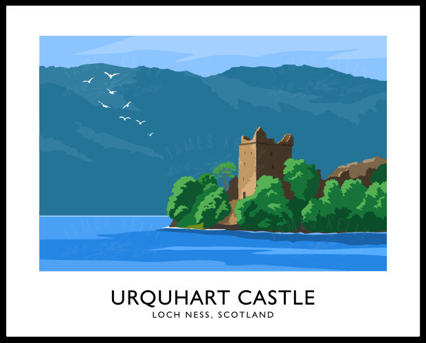 Vintage style art print of Urquhart Castle on the shores of Loch Ness in Scotland.. Inspired by old vintage railway posters of the early 20th century.