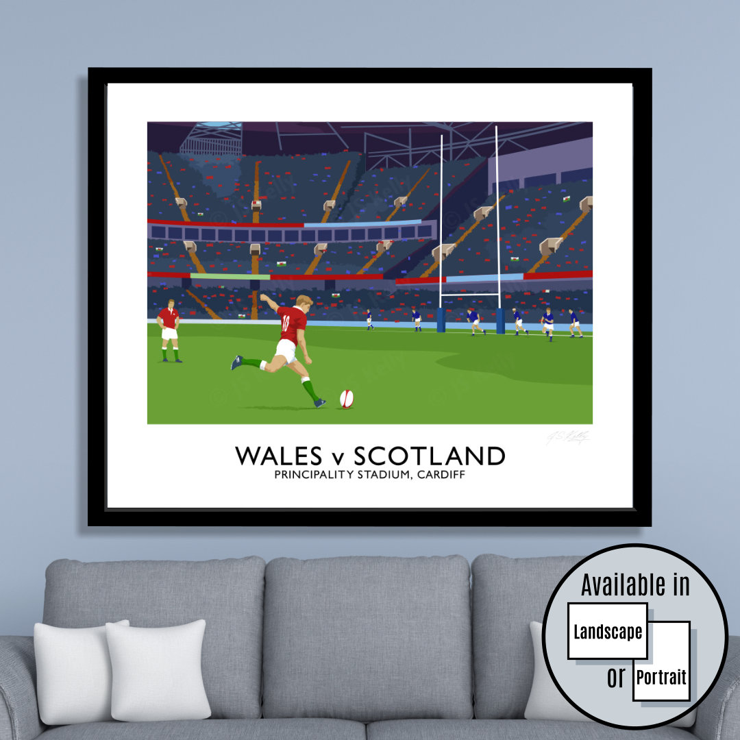 Vintage style travel poster art print of a Six Nations international Rugby Union match between Wales and Scotland at the Principality Stadium, Cardiff.